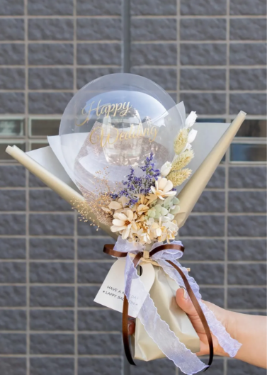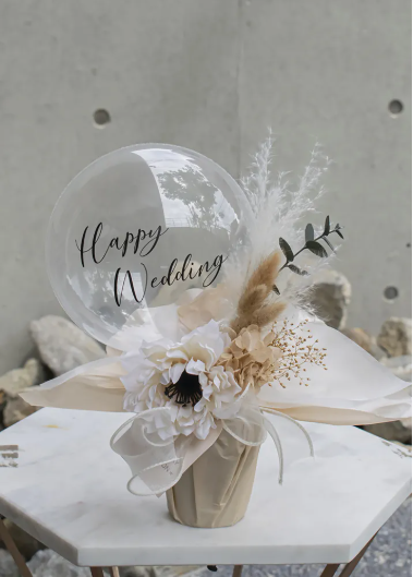 上品なドライフラワーと美しいクリアバルーンを組み合わせた「Happy Wedding」バルーンギフトは、結婚祝いにぴったりの落ち着きと華やかさを併せ持っています。
