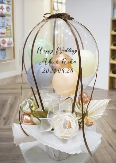 空を飛ぶ気球のようなバルーンは見ると気持ちが和らぎ、想いを優しく膨らませてくれます。中央のクリアバルーンには、お二人の記念日やお名前などを入れることができ、世界に一つだけのオーダーメイドギフトに。