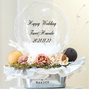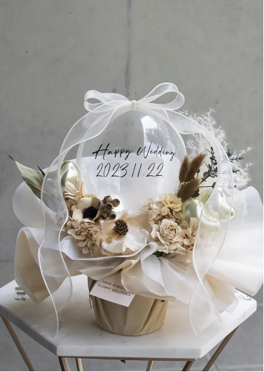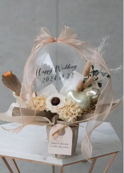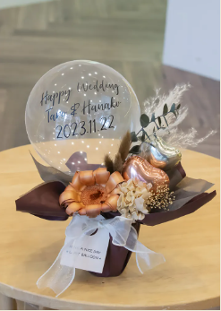 トレンドの韓国風デザインを取り入れ、くすみカラーのドライフラワーとリボンの組み合わせで、華やかさと落ち着きを絶妙に演出。バルーンには「Happy Wedding」等カスタムでなんでもメッセージを入れることができ、ウェディングのお祝いにぴったり。温もりと高級感を両立したラッピングがこだわり。