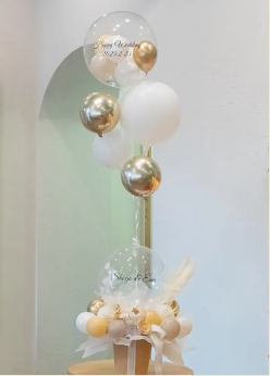 | 仕様 | 材質:バルーン、ドライフラワー、造花、リボン、ペーパーラッピング ラッピング:ベージュフィルム+ホワイトオーガンジーリボン 台座付き(プラスチックカップ) |