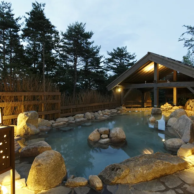 館内はすべて畳敷きで、自然に囲まれた露天では星を眺めながらの入浴が味わえると紹介されている。