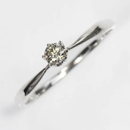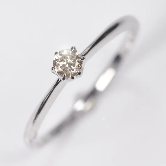 0.1ctの一粒ダイヤをティファニー爪で留めた、いわゆる王道のソリテールリングとのこと。SIクラスらしい澄んだ輝きがあり、婚約指輪としてはもちろん、記念日のギフトや「ひとつは持っておきたい定番ダイヤリング」としても選ばれやすいタイプだそうだ。素材はプラチナで、石の品質を示す鑑別書も付くため、初めてダイヤを贈る人でも選びやすい安心感があるデザインだと紹介されている。