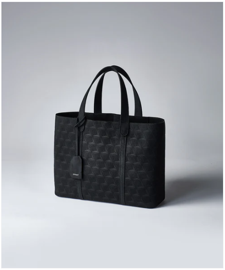 上質さを大切にしたい大人向けに作られた〈エスティバン〉のミディアムトート。全面に入ったモノグラム柄は、特殊な加工によるもので、派手すぎず上品に存在感を放ちます。A3サイズの書類も余裕で収まる大きさに加え、マチも広めなので、荷物が多くなりがちな日でも安心して使えそうです。やわらかな生地感と相まって、実用性がありながらも高級感のある印象に仕上がっています。素材には植物由来の再生資源を一部使用しており、環境面への配慮がされている点もポイント。内側にはポケットを備え、チャームには鍵を付けられるリング付き。開口部はスナップボタン仕様で、中身が見えにくいよう工夫されているなど、日常使いをしっかり意識した作りです。