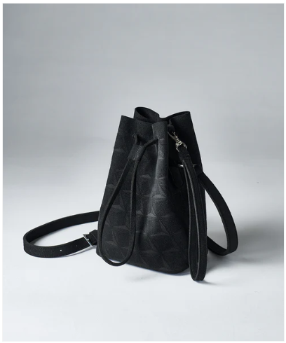 〈エスティバン〉らしい上品さが際立つ、モノグラム柄の巾着バッグ。大人向けの落ち着いたデザインで、持つだけでコーディネートを引き締めてくれる印象です。ショルダー用と手持ち用、2種類のストラップが付属しており、シーンや気分に合わせて持ち方を変えられるのも便利なポイント。ショルダーストラップは細かく長さ調整ができるため、体型やスタイルを選びにくそうです。背面にはカードポケット、内側には鍵を取り付けられるリングも備わっていて、見た目だけでなく使い勝手にも配慮されています。環境に配慮した再生素材を一部使用している点も、今の時代に合った選択肢だと感じました。