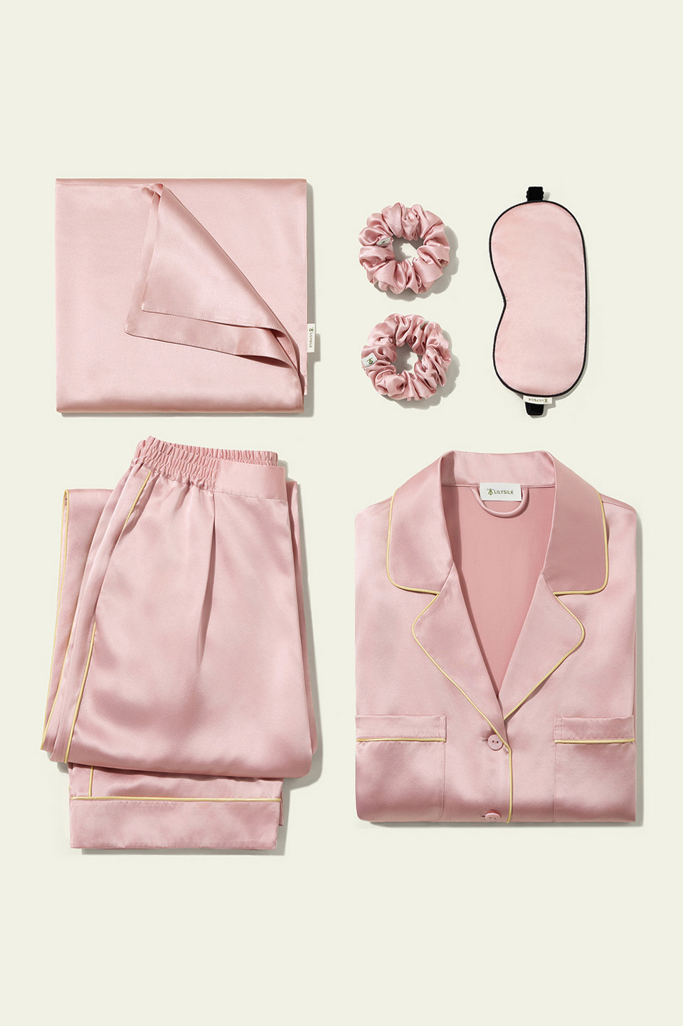 このセットには、着心地と見た目のバランスを意識したサテン素材のパジャマが含まれています。縁には落ち着いたゴールドカラーのラインが施され、派手すぎない上品さがあります。枕カバーはデザインに主張が少なく、寝具全体に自然な統一感を与えます。さらに、同系統のヘアアクセサリーとアイマスクが組み合わさり、就寝前の時間を静かに整えてくれる構成です。日々の疲れをゆるめたいときや、睡眠の質を大切にしたい人への贈り物としても選ばれやすい内容だと感じます。
