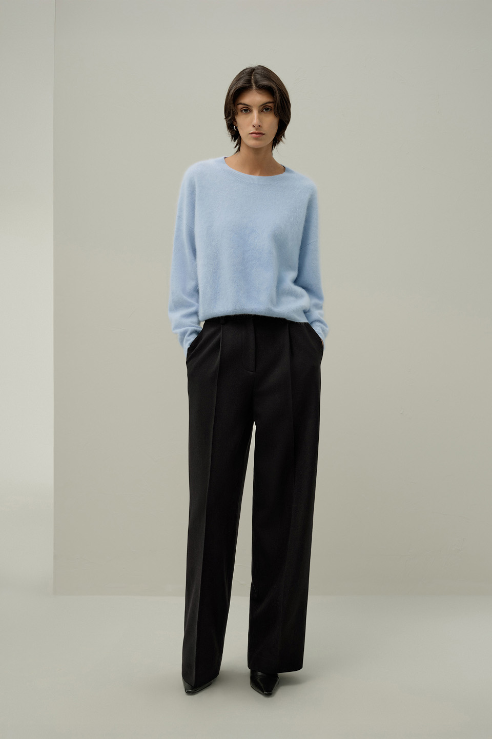 装飾を抑えたクルーネックのプルオーバーで、ヒップに軽くかかる丈感のため、合わせるボトムを選びにくい一枚です。素材はカシミヤ100%で、ふんわりとした起毛感がありつつも厚すぎず、日常使いしやすい仕上がりです。色味は落ち着いたグレーで、きれいめにも普段着にも自然になじみます。デザイン自体はベーシックですが、素材の質と全体の形が整っているため、着るとさりげなく洗練された印象になります。ニットにシルク素材のロングスカートを合わせると、気負わずに落ち着いた雰囲気を演出できます。柔らかな触感とあたたかみのある表情が、季節感を穏やかに引き立ててくれます。