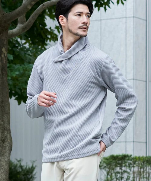 実際に触れると軽さがありながら、生地にはしっかりとした厚みと立体感があります。ワッフル調の凹凸があるため、無地でも表情があり、ジャケットのインナーとしても一枚着としても成立します。シンプルなのに地味に見えにくい、という印象です。