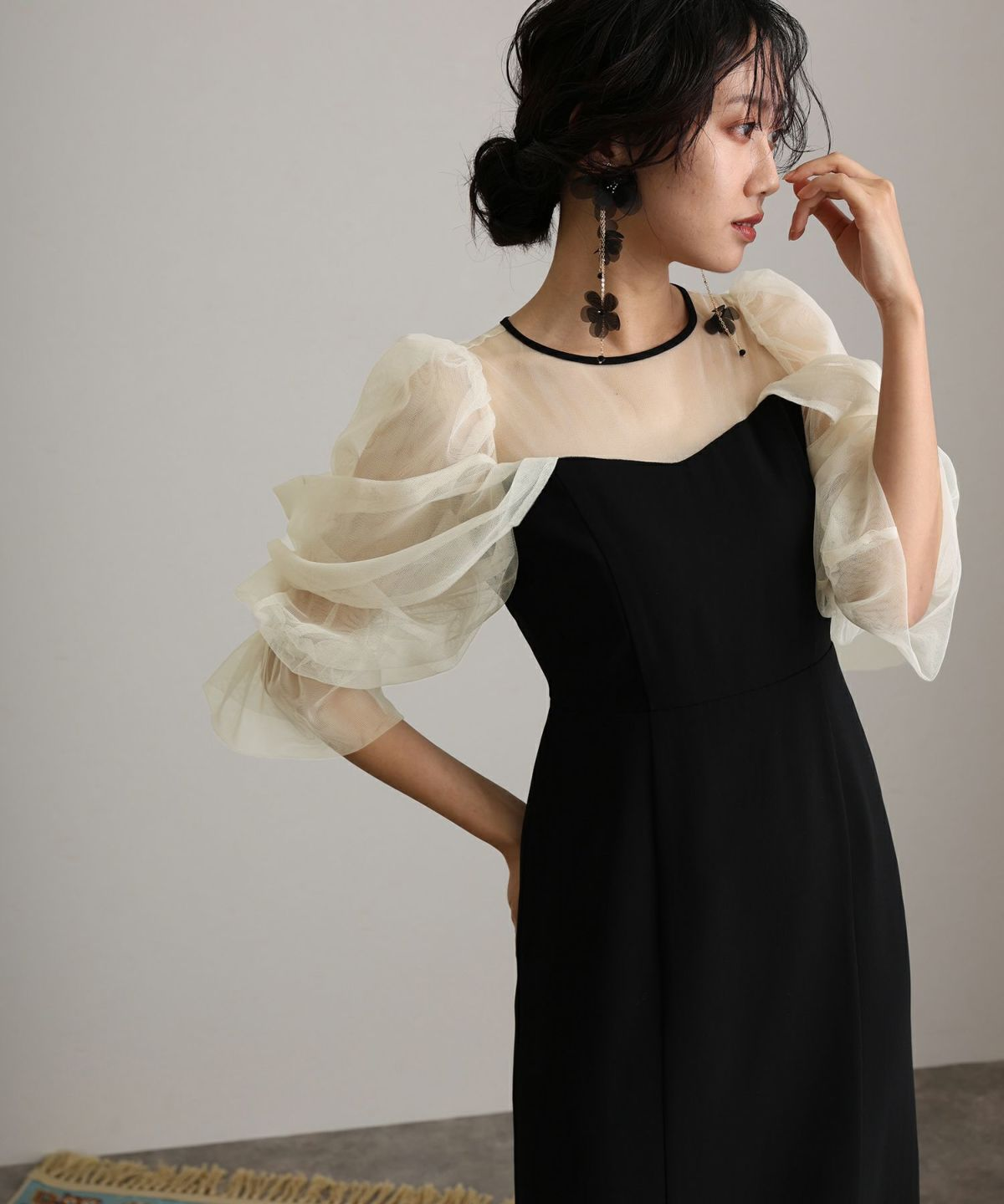 上半身は、肩に抜け感のあるデザインとチュール素材の透け感が合わさり、洗練された印象に仕上がっています。二の腕やウエスト、ヒップ、脚のラインをやさしく包み込み、気になる部分をさりげなくカバーしてくれます。袖丈はゴム仕様で調整できるため、好みやシーンに合わせた着こなしが可能です。