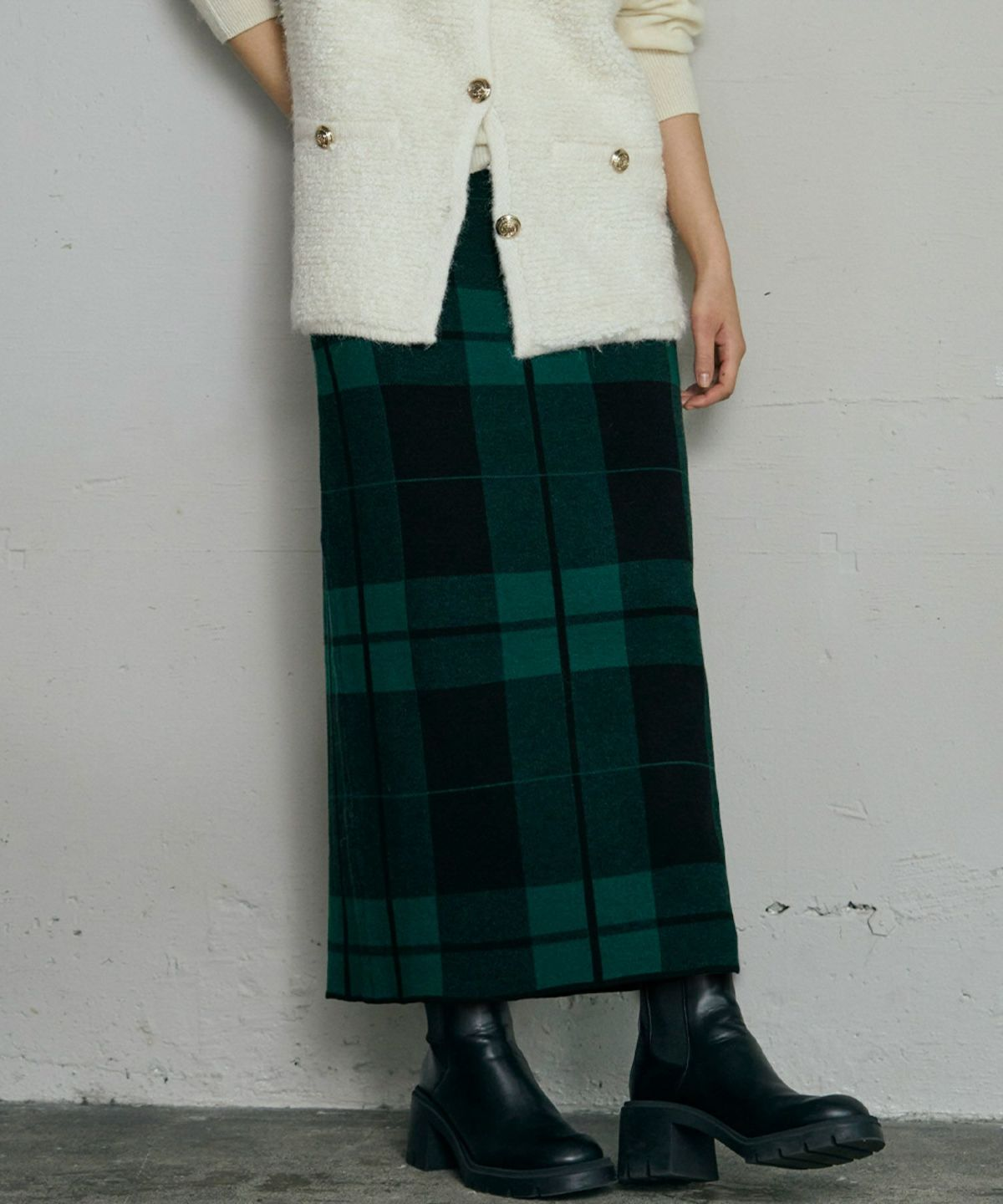大きめのチェック柄が印象的で、コーディネートにほどよい抜け感を与えてくれるニットタイトスカートです。存在感のある柄ながら主張しすぎず、秋冬の装いのアクセントとして取り入れやすい一枚だと感じられます。